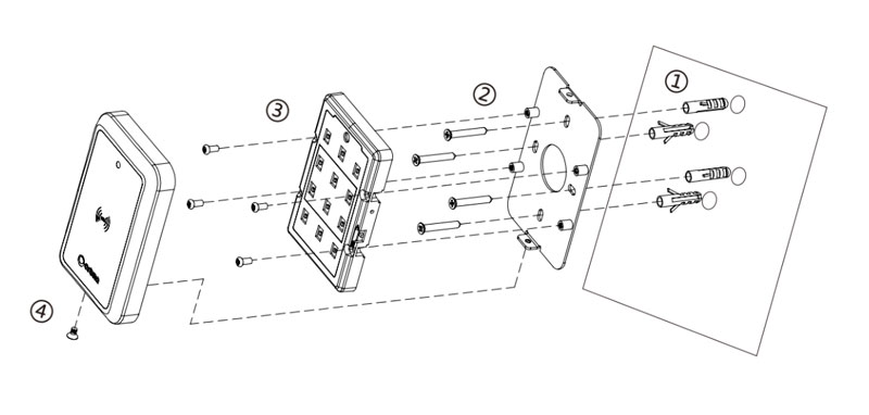 1 Drill holes in the metal plate Fasten the metal base of the card reader to the metal plate with screws and nuts The rest steps are the same as those of the wall mounting.